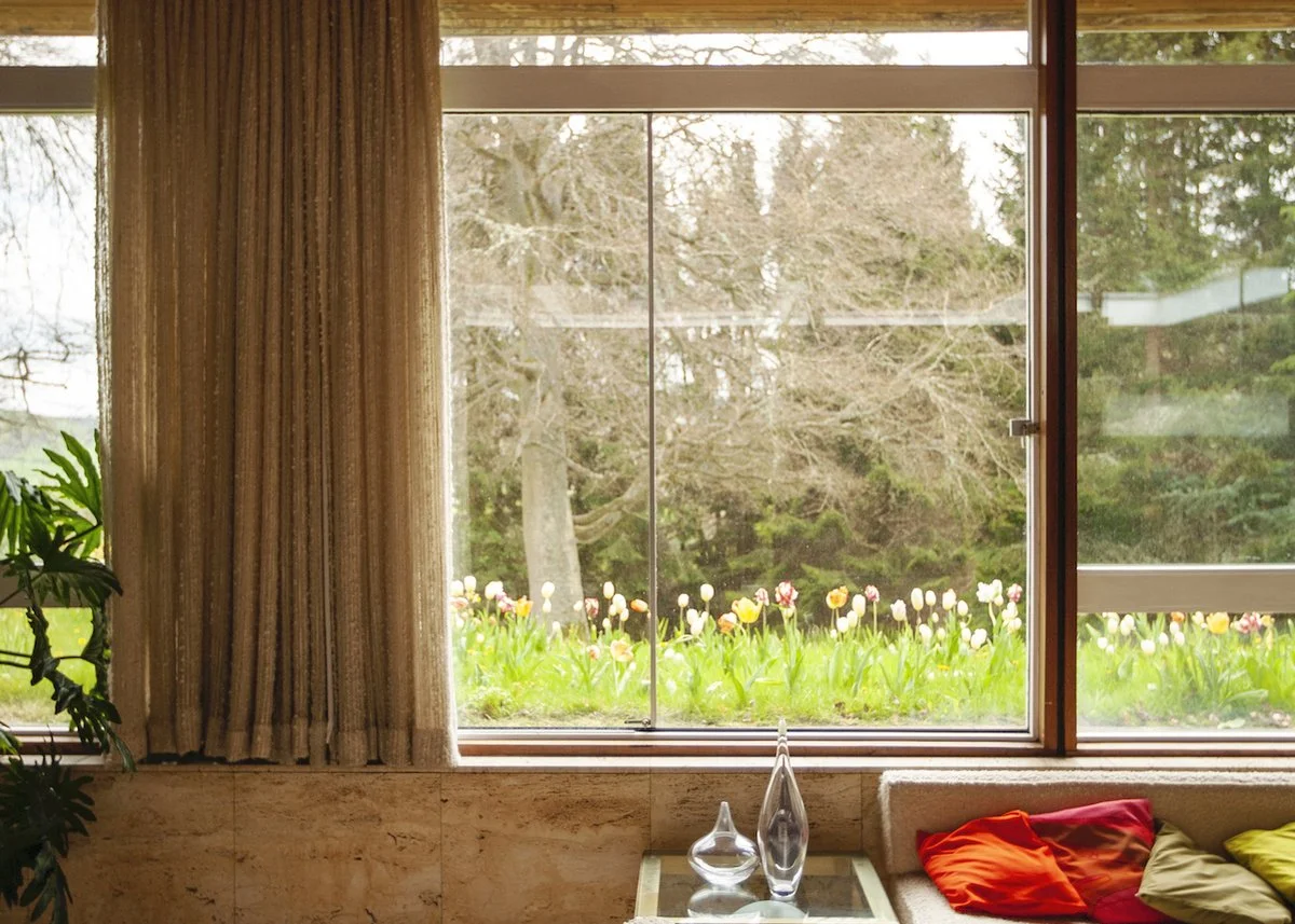 In 1952 his business took off as he began supplying Woolworth’s and Marks and Spencer’s with scarves. By 1966 his firm employed over 600 people as he drew inspiration for new cloths and patterns from the Border countryside citing the colours of the seasons and their blurring and the transformation of natural hues as ‘breathtaking’. Eventually, most of the mill’s production was focused on two collections a year for the couture trade in London and Paris – Chanel first used his textiles in 1963. Both the textures and the colours that are framed from the interior of the house are clearly evident in the cloth made by Bernat Klein Design.
