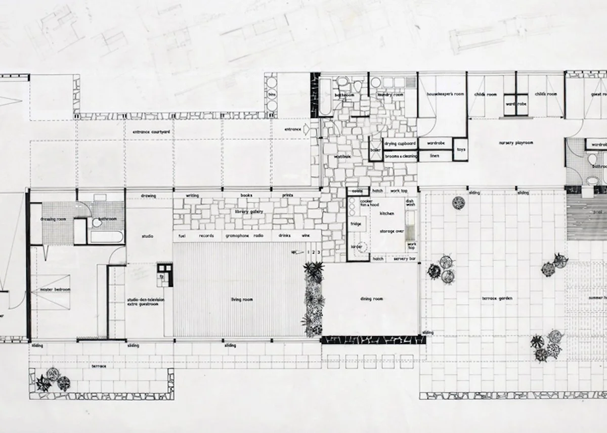In constructional terms, High Sunderland is relatively simple. A prefabricated makore timber frame on an 8ft grid sits atop a concrete raft foundation. Peter used grids as an organising device in all his houses, he testified to planning in this way stating that it permitted ‘the interior and the exterior of the house to ‘read’ together’. The open plan enabled by such an approach was referred to by Peter as ‘circular planning’. In this case, it was more pivotal planning, as the kitchen and other service areas effectively split the house into two with the parents’ bedroom and living areas to the west and children’s bedrooms and play area to the east. The frame occupied the entire concrete apron, but the interior of the house did not. An open double garage, two courtyards and a terrace punctuated the grid, optimised the daylight conditions and emphasised the relationship between interior and exterior. The house was altered in the 1980s and what had been external space, under cover was enclosed to form a studio space. This was made possible by the construction system and described by the Kleins as ‘most adaptable’.